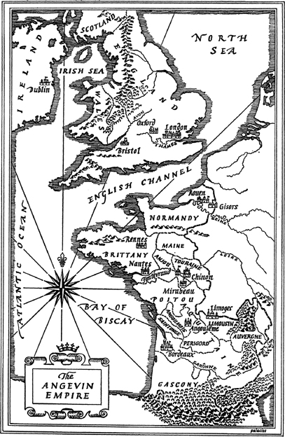 HENRY’S troubles came upon him when his power was at its height. In 1171 his third son Geoffrey was married to Constance, the heiress of Brittany, and assumed the title of duke of that rugged corner of France, with its rocky shores and tumultuous streams, jutting out between the Sleeve (as the French always called the Channel) and the Bay of Biscay. Now all of northern France was included in the Angevin empire, as well as the west and some of the south. Henry was titular head of the Norman dynasty in Sicily and through his marriage to Eleanor occupied the same suzerainty to the Aquitainian kings of Antioch. England stood higher in the Christian world than at any time before. In London there were always special ambassadors (though that term for them had not yet been coined) from other countries to negotiate military or trade agreements. Englishmen were playing prominent parts on the Continent. As a final step in fitting the futures of his children into his dream of empire, Henry arranged a marriage for John with the heiress of Maurienne.