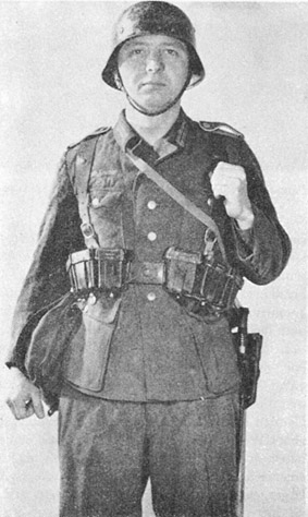 The German soldier habitually wears his belt, with or without field equipment. Normally the enlisted man wears a black leather belt, but a web belt goes with the tropical uniform. The belt always is worn with a steel buckle bearing the branch of service emblem. All ground forces of the Army (Heer) have a buckle embossed with a circular crest in the center of which appears an eagle. The circle is formed by the words "Gott mit uns" above the eagle and a wreath below. The Air Force (Luftwaffe) buckle carries an eagle in flight with a swastika in its claws. The figure is encircled by a wreath. The Armed Elite Guard (Waffen SS) buckle bears an eagle whose outstretched wings extend across the top of the buckle. The words "Meine Ehre heisst Treue" make a nearly complete circle below the eagle's wings. The bird rests on another smaller circle which bears a swastika. Officers wear brown leather belts with a simple tongue-and-bar type buckle. In the field the soldier carries his cartridge pouches, bayonet, entrenching tool, and "bread bag" suspended from this belt. When not wearing field equipment he wears the belt and buckle alone. Metal hooks in the field blouse help hold the belt in place.