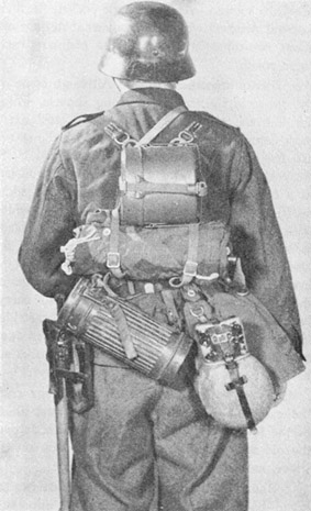 One engineer assault pack is authorized for every five combat engineers. It is used with the infantry cartridge-belt suspenders and consists of a canvas pack worn on the back and two canvas pouches used in place of the regular cartridge pouches. Two smoke pots are carried in the top of the pack and a 3-kilogram boxed demolition charge in the bottom. In addition, the mess kit, which fits in a special pocket, and shelter quarter are carried in the pack. The pouches hold egg-shaped grenades with rifle ammunition in side pockets. There is a special pocket on the right pouch for a gas mask without carrier. The men to whom this assault pack is issued also receive Model 39 haversack.