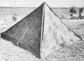 Figure 26.—Four shelter quarters pitched as a pyramidal tent. These carry the Waffen-SS camouflage pattern.