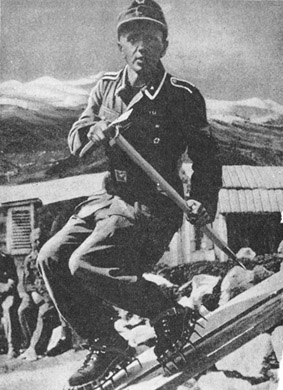 Figure 28.—A Waffen-SS mountain sergeant teaches the use of ice ax and crampons while simulating the descent of an ice slope. The crampons are strapped to ski-mountain boots.