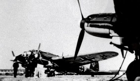Horst Götz on his plane, a Heinkel 111, with the emblem of his unit, a Viking ship (KGRI00)