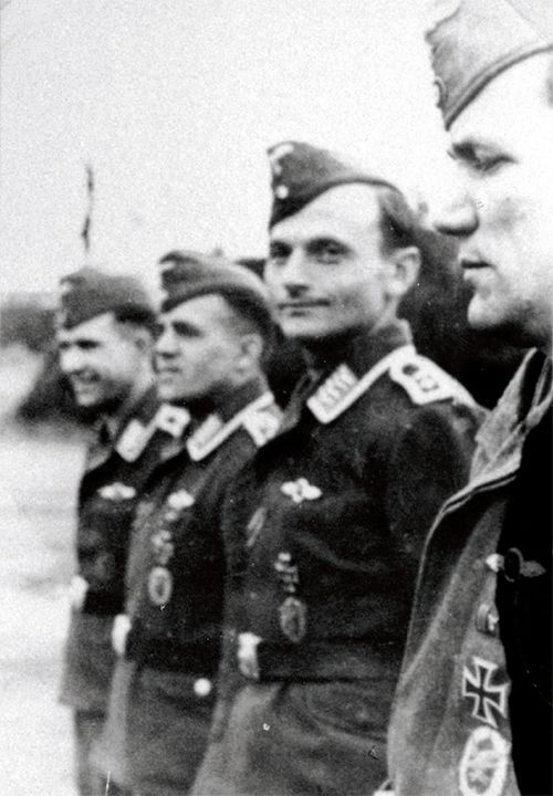 The first awards for 60 combat sorties (silver) are handed out to the group on 27 March 1941. From left to right: Sigi (Siegfried) Simon, Wisch, me (Sommer) and Schulte.