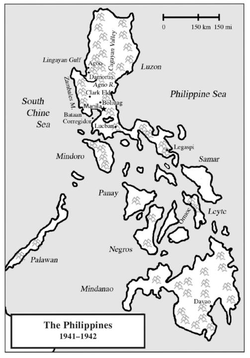 Bataan juts south like a thumb from Luzon, Manila Bay to the east and the South China Sea to the west. The defense plan established two lines that stretched across the peninsula from bay to sea. The main battle position was located at the base of the peninsula, and the rear battle position was located about halfway to the tip. Wainwright's I Philippine Corps held the eastern half and Parker's II Philippine Corps the western."