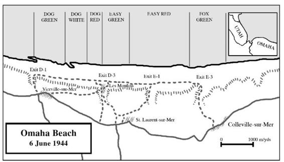 Omaha Beach was about 7,000 yards wide and flanked by cliffs, and defensive obstacles covered the sand. Next came a shingle shelf, which presented a problem for vehicles, and then either a seawall or sand dunes. After a flat, somewhat marshy stretch of ground, bluffs honeycombed with German defensive positions rose 170 feet. A mere four draws offered exits from the beach.L9
