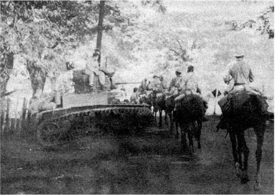 Crewmen of a 192d Tank Battalion M3 light tank watch the 26th Cavalry, Philippine Scouts, pass in December 1941. Both outfits would soon give battle to Japanese invaders. SIGNAL CORPS PHOTO