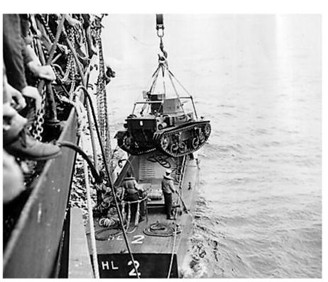 The Army knew before the United States entered the war that it would have to put tanks on hostile shores. Tank lighters, such as this one participating in a 1st Division landing exercise in August 1941, could only carry light tanks, in this case an M2A4, which had to be hoisted from transports. SIGNAL CORPS PHOTO