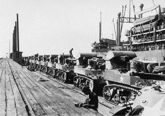 M5 light tanks belonging to the 756th Tank Battalion (Light) await loading for the journey to North Africa for Operation Torch. They are waterproofed and fitted with wading stacks much like those that will be used in amphibious landings for the rest of the war. SIGNAL CORPS PHOTO