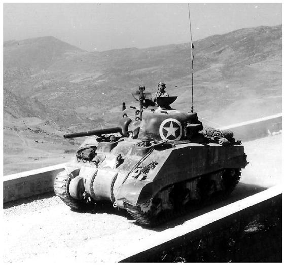 A 757th Tank Battalion M4A3 (76-millimeter) crosses the Po River on 26 April 1945. After soldiering with the oldest tanks in the arsenal into 1944, tankers in Italy caught up with their counterparts in the European theater by early 1945. SIGNAL CORPS PHOTO