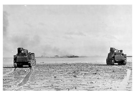 Meanwhile, because the command radio had been ruined by seawater, battalion command personnel had to move from tank to tank to direct fire and move vehicles into more advantageous positions. Both technical sergeants and the radio operator in the group were wounded 35