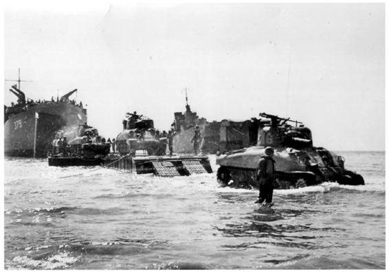 Amphibious duplex-drive M4A 1 s from the 70th Tank Battalion sit on Utah Beach on 6 June 1944. The Allies used DD tanks in Operations Overlord and Dragoon and in the Rhine crossing. SIGNAL CORPS PHOTO