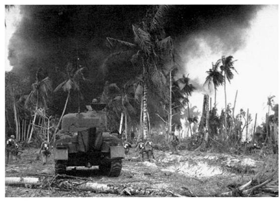 M3 tanks shell the Japanese at King's Wharf, Makin Atoll, on 21 November 1943. These Lees belong to Company A, 193d Tank Battalion. The first tank battalion to go on the offensive against Japan, the outfit equipped one company with M3 mediums, one with M3 light tanks, and one with amtracs. SIGNAL CORPS PHOTO