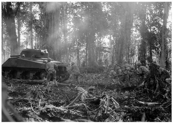 GIs from the 37th Infantry Division on Bougainville advance behind a Sherman belonging to the 754th Tank Battalion on 16 March 1944. They are using a formation developed on the island for jungle warfare, with target designators at the rear corners of the Sherman and riflemen, BAR men, and engineers in a wedge behind. SIGNAL CORPS PHOTO