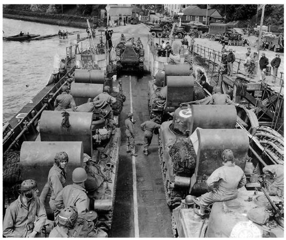 70th Tank Battalion Shermans load onto a landing craft, tank (LCT), in Kingswear, England, on 1 June 1944. These Company C tanks beat the amphibious duplex drive tanks to Utah Beach in Normandy on 6 June, a screw-up that worked out well. SIGNAL CORPS PHOTO