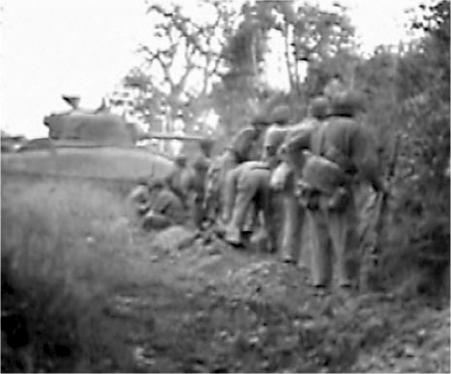 Infantrymen shelter behind a hedgerow while an M4A 1 tank fires at the next one. For both partners, the bocage was a checkerboard hell. SIGNAL CORPS FILM
