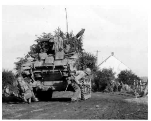 A barely recognizable 740th Tank Battalion Sherman attacks toward Heeresbach, Belgium, on 28 January 1945 with the 82d Airborne Division's 504th Parachute Infantry Regiment. "At a distance of fifty yards it was impossible to tell what kind of a vehicle it was-even if you determined that it actually was a vehicle," said the battalion commander. SIGNAL CORPS PHOTO