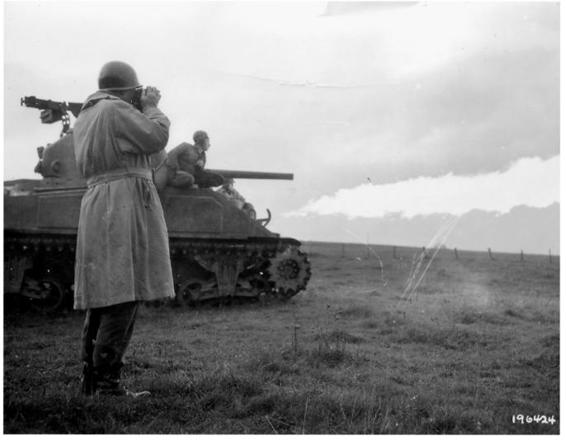 Lieutenant General George Patton Jr. takes a picture of a demonstration of the E4-5 hullmounted flamethrower that began reaching tank battalions in September 1944. The flame unit was also used in the Pacific theater. SIGNAL CORPS PHOTO