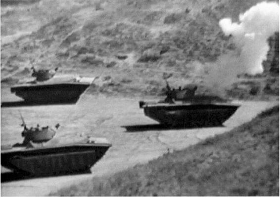 LVT(A)(1) (left) and LVT(A)(4) amtanks belonging to Company D, 708th Amphibian Tank Battalion, line up to attack with the Marines on Saipan in June 1944. MARINE CORPS PHOTO