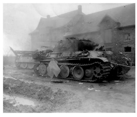Two 12th SS Panzer Division Panthers knocked out during the fighting in Krinkelt, Belgium, beginning 17 December 1944. SIGNAL CORPS PHOTO