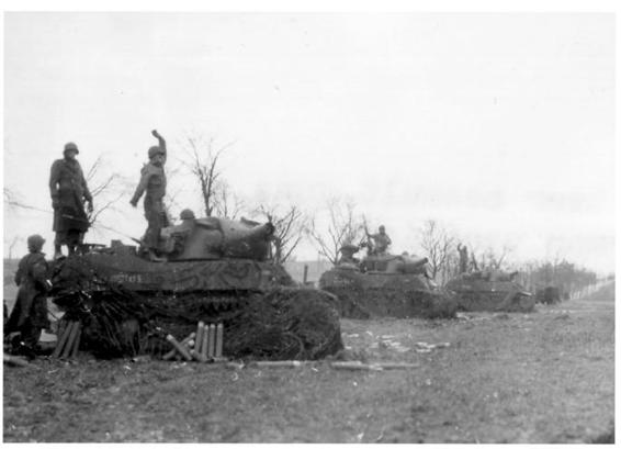 78th Infantry Division doughboys ride Shermans from the 741st Tank Battalion toward the Rhine River on 9 March 1945. SIGNAL CORPS PHOTO