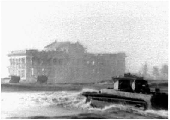 Soon Thornton was standing atop his strange armored boat. His head, more than ten feet above the deck, swung through wild arcs as the LCT pitched and yawed. The bow door opened, and it was action time. Thornton could see the beach four miles away and explosions from the naval bombardment churning the bluffs just beyond. Yellow launch flags went up, and Thornton ordered his driver, who could see nothing over the DD's canvas wall, to ease forward into the choppy water.