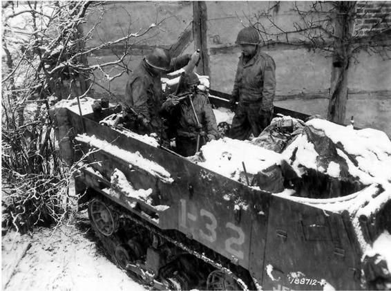 The mortar platoon in light, medium, and standard tank battalions used half-track-mounted 81millimeter mortars such as this M4A 1 mortar carrier, at work in Belgium in early 1945. Some outfits made good use of the platoon, but many did not. SIGNAL CORPS PHOTO