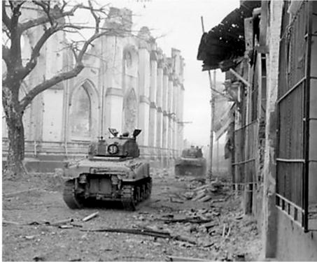 M4A1 Shermans roll through Manila on 23 February 1945. In ten days of street fighting, Company B, 44th Tank Battalion, expended 3,500 rounds of 75-millimeter and 183,000 rounds of .30-caliber ammunition. U.S. NAVY PHOTO