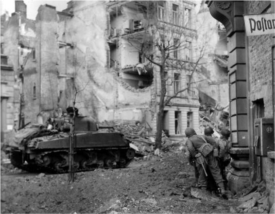 A 750th Tank Battalion Sherman works with 415th Infantry Regiment doughs in Cologne on 6 March 1945. Tankers and GIs time and again disproved early-war doctrine that tanks should not fight in cities. SIGNAL CORPS PHOTO