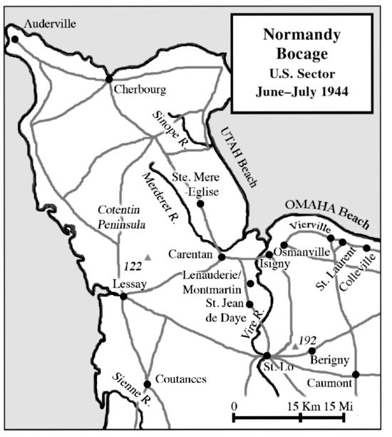 South of St. Jean de Daye, the hedgerows were spaced so close together that a man could sometimes run from one to another across an open stretch of field in four or five seconds-if nothing stopped him.