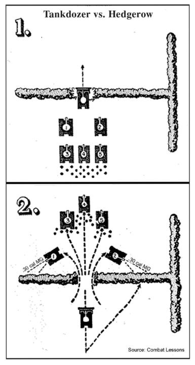 In order to use tactics, the tanks had to be able to move. The first approach to overcoming the challenge posed by the terrain itself was to have a tankdozer punch a hole through the hedgerow, which the tanks would pass through to support the infantry. This occurred to tankers as soon as they saw the hedges.25 Experience showed that dozers were capable of breaching about 50 percent of hedgerows.26