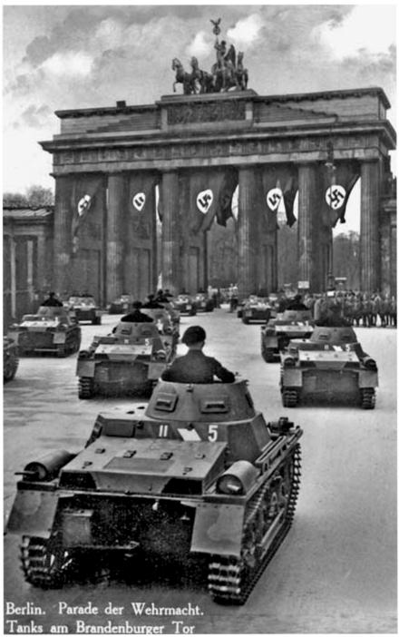 20 April 1938: Panzer-Regiment 5 lines up for the 49th birthday celebration of the head of state in Berlin. The Brandenburger Tor can be seen in the background.