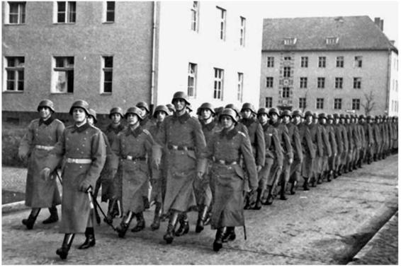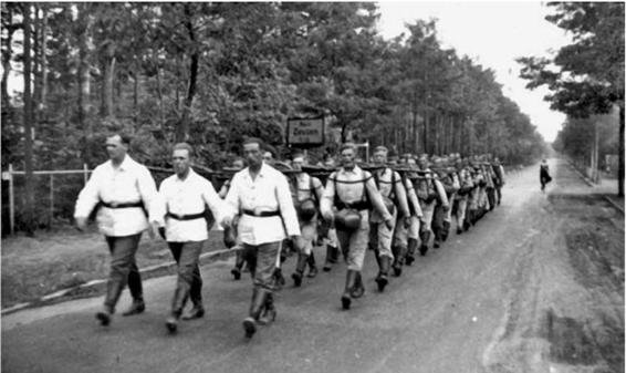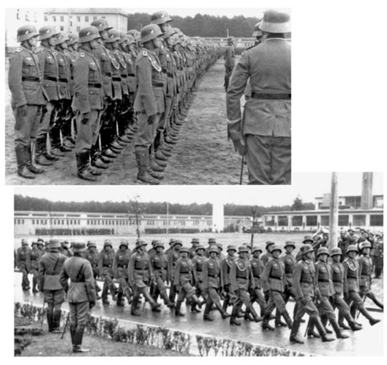 Spring 1938: Hauptmann Gierga and his 1st Company march out to a swearing-in ceremony. All the way to the left is Leutnant Hans Sandrock, who received the Knight's Cross to the Iron Cross on 18 October 1944.
