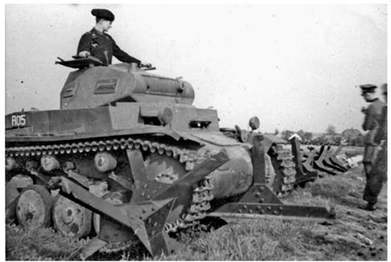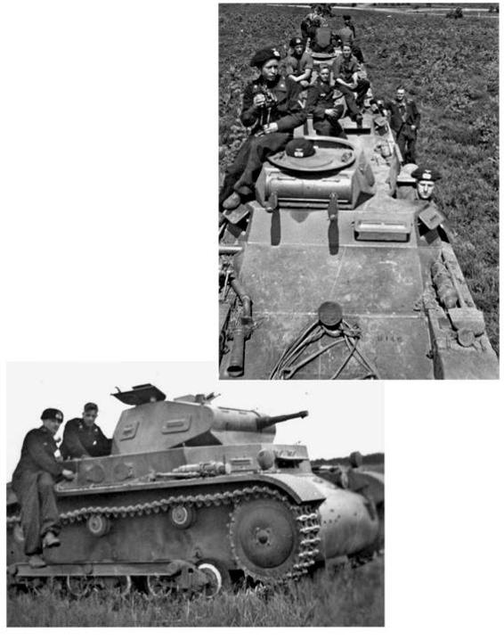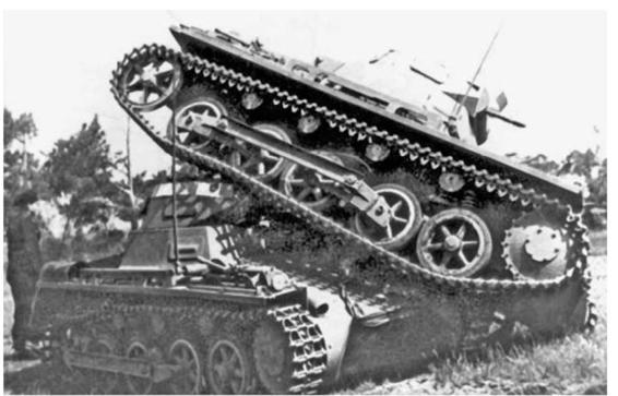 Panzer Is and Panzer II's negotiate water obstacles. In the one image, the chassis of an early-model Panzer I can be seen forming the support for the expedient bridge.