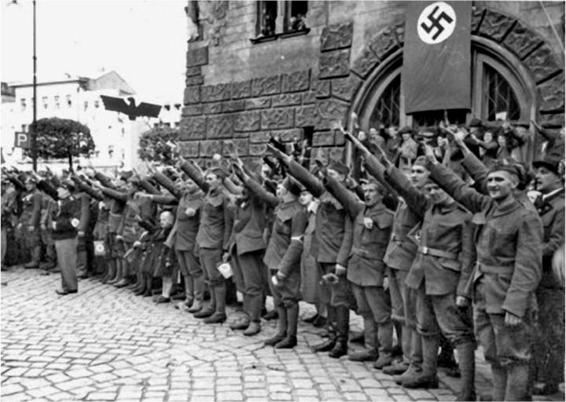 Czech soldiers provide the "German greeting." The men are probably ethnic Germans, who had been conscripted into the Czech Army.