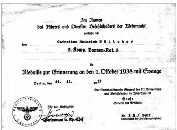 Award certificate for the commemoration medal. This one, complete with the "Prague" clasp, was awarded to Gefreiter Heinrich Bottcher of the 5th Company.