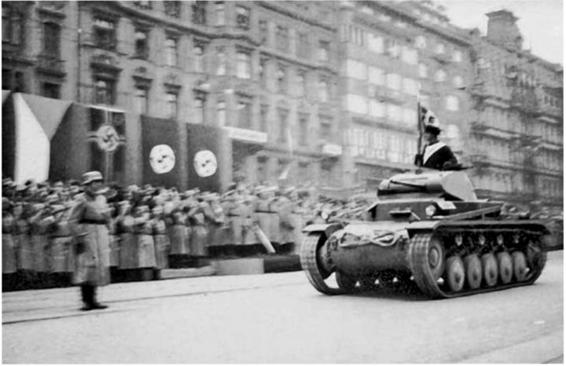 19 March 1939: Parade in Prague for GeneralBlaskowitz, the Commander-in-Chief of Heeresgruppe 3. A Panzer 11 of the 1st Battalion moves past the reviewing stand with the battalion standard.