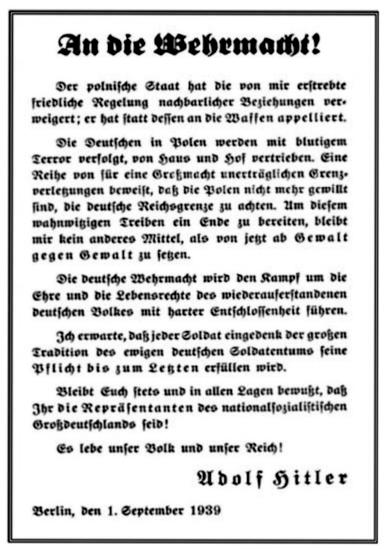 The German head of state appealed to the armed forces at the start of the war on 1 September 1939 as follows:'