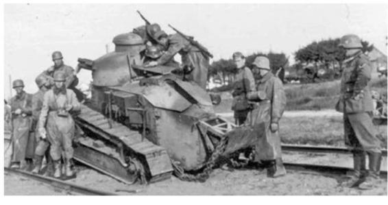A Polish tank knocked out on the way to BrestLitowsk. It is a World War I-era Renault Fr 17/18 light tank.