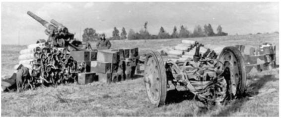 Firing position of the division's Artillerie-Regiment 75. The artillery piece is a 15-cm sFH 18.