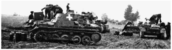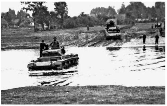When the armored cars of Aufkliirungs-Abteilung 3 (mot) encountered energetic resistance towards noon on 16 September, Hauptmann Schmidt's 2nd Company was brought forward to attack by the battalion commander, MajorWendenburg. Schmidt had 19 operational tanks. Combat engineers mounted the vehicles. Moving rapidly, the tanks entered the enemy positions, breaking the resistance. Horse columns were scattered, vehicles went up in flames and antitank guns were destroyed. The advance was continued during the night of 16-17 September. The marshy terrain and thick woods slowed down the advance. The 4th Company took over the lead.