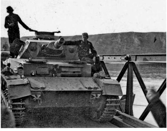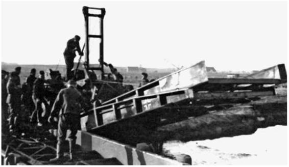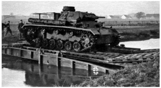 In expectation of the campaign in the West, intensive training was conducted in water crossings with vehicles. In this case, a Panzerbefehlswagen III crosses a creek by means of the bridge from an armored bridge layer.