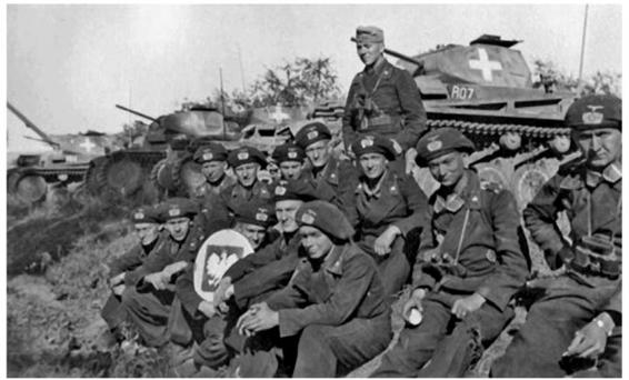The light tank platoon of the regimental headquarters during a break in operations. Note the Polish border marker one of the men is holding.