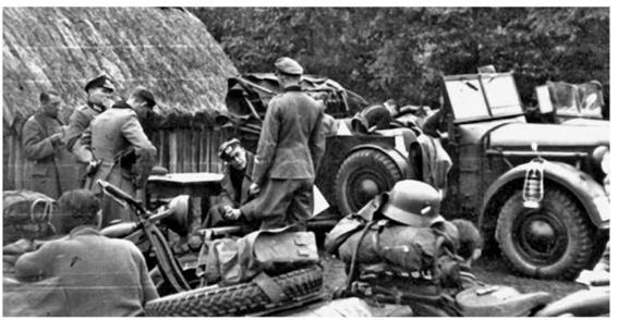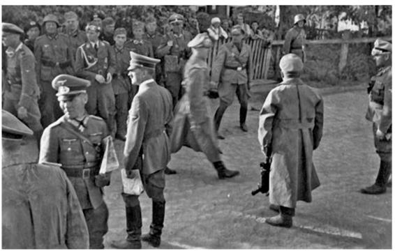 5 September 1939: The Supreme Commander of the Armed Forces visits the XIX Armee-Korps (mot). GeneralmajorRommel, who was the commander of Hitler's security detail at the time, is seen with the map in the crook of his left arm.