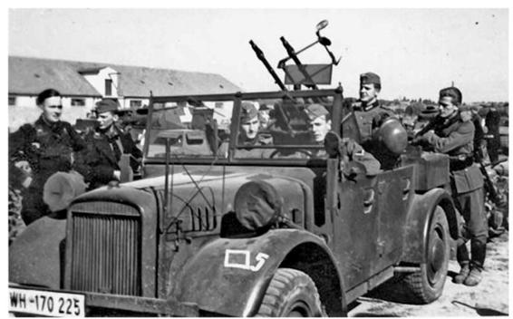 A wheeled vehicle (Kfz. 4) of the regiment with a twin machine gun for antiaircraft defense.