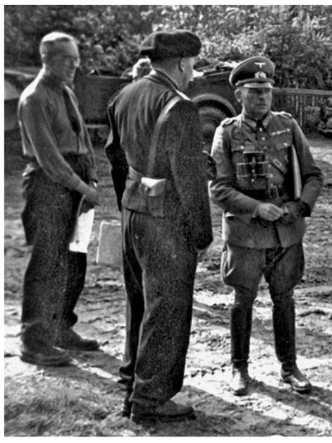 Commanders in conference with Guderian: Oberstleutnant Conze is to the viewer's far left and Oberst Stumpff, the commander of the 3. PanzerBrigade, is wearing the full Panzer uniform.