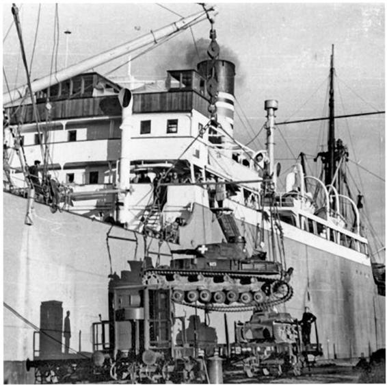 The harbor at Pillau at the beginning of October 1939. The regiment's tracked vehicles are loaded on to transport ships.