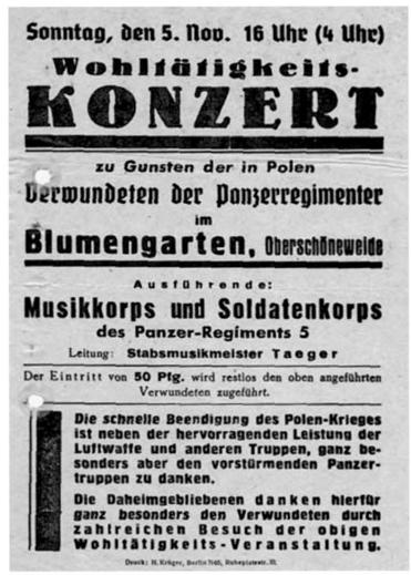 5 November 1939: The regimental band holds a concert for the wounded from the campaign in Poland. The text reads: "Sunday, 5 November, 1600 hours (4 o'clock). Charitable concert for the benefit of the wounded of the tank regiment in Poland at the Flower Gardens in Oberschoneweicle. Performing: The music corps and choir of Panzer-Regiment 5. Directing: StabsmusikmeisterTaege. The entrance cost of 50 Pfennige will be given exclusively to the wounded. The rapid end of the war in Poland is especially thanks to the advancing armored forces, in addition to the magnificent performance of the Luftwaffe and other forces. Those who remained at home can especially thank the wounded by attending the charitable event in large numbers."