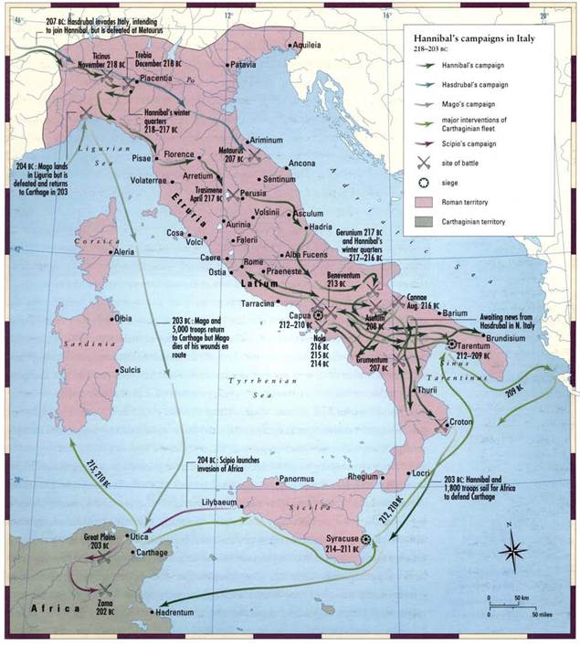 The march of Hannibal's army from Spain to Italy in 218 вс was one of the epics of Ancient History. Between 218—216 вс Hannibal won an unbroken series of victories at Ticinus, Trebia, Trasimene, and Cannae. Somehow the Romans absorbed their appalling losses and continued the war, when any other contemporary state woidd have accepted peace terms at this point. After Cannae, much of southern Italy defected to Hannibal, who was forced to fight to protect his new allies. Although never able to defeat Hannibal in battle, the Romans gradually used their superior numbers to defeat his allies. In 207 вс Hannibal’s brother brought a fresh army to Italy, but it was a sign of the experience the Romans had gained since 218 вс that it was rapidly cornered by a superior force and destroyed. In 203 вс Hannibal was finally recalled to defend Carthage from the Roman invaders and led his unbeaten army from Italy. The next year he suffered his only defeat in a pitched battle at Zama, bringing the war to an end.