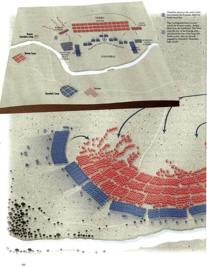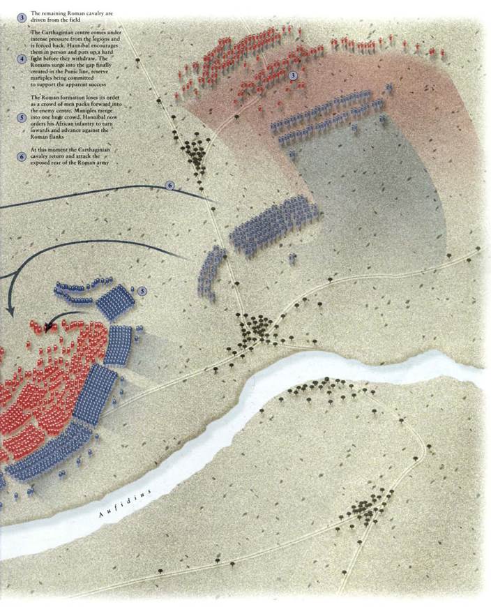 Hannibal's victory at Cannae was his greatest achievement. In an open plain he encircled and destroyed a numerically superior Roman army, killing nearly 50,000 men and capturing around 20,000 more for the loss of 5,700 of his own men. It is now uncertain on which batik of the River Aufidius the battle was fought. This map shows the modern course of the river.