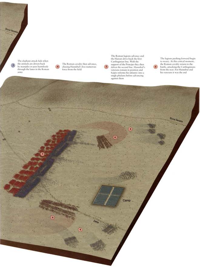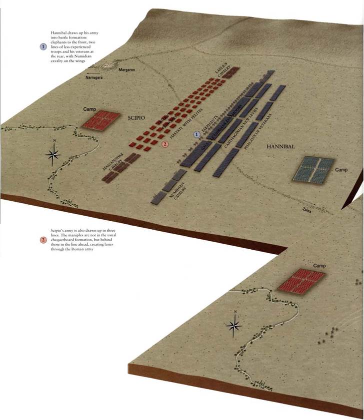 At Zama Hannibal was faced with a well-trained Roman army under the command of the highly gifted Scipio. The result was a slogging match, far less tactically subtle than his earlier battles. Outnumbered in cavalry, Hannibal attempted to wear down the Roman infantry, first with a charge from his large force of elephants, then by forming his foot into three lines, keeping his Italian veterans in reserve. Scipio negated each of these threats in turn and the battle was finally decided by the return of the Roman cavalry.